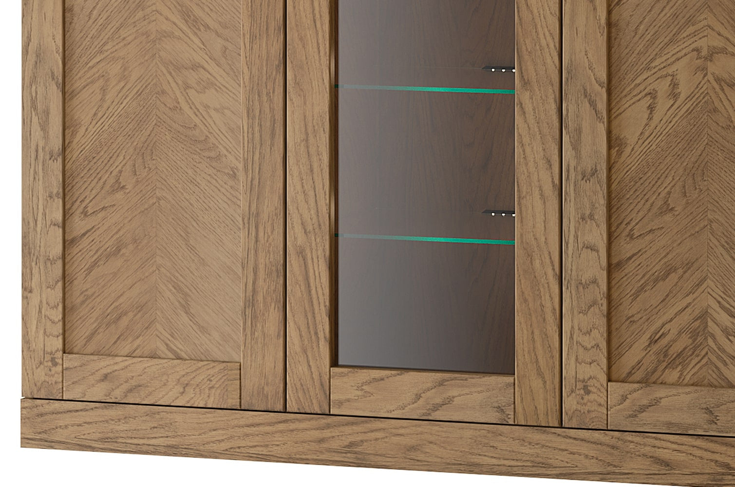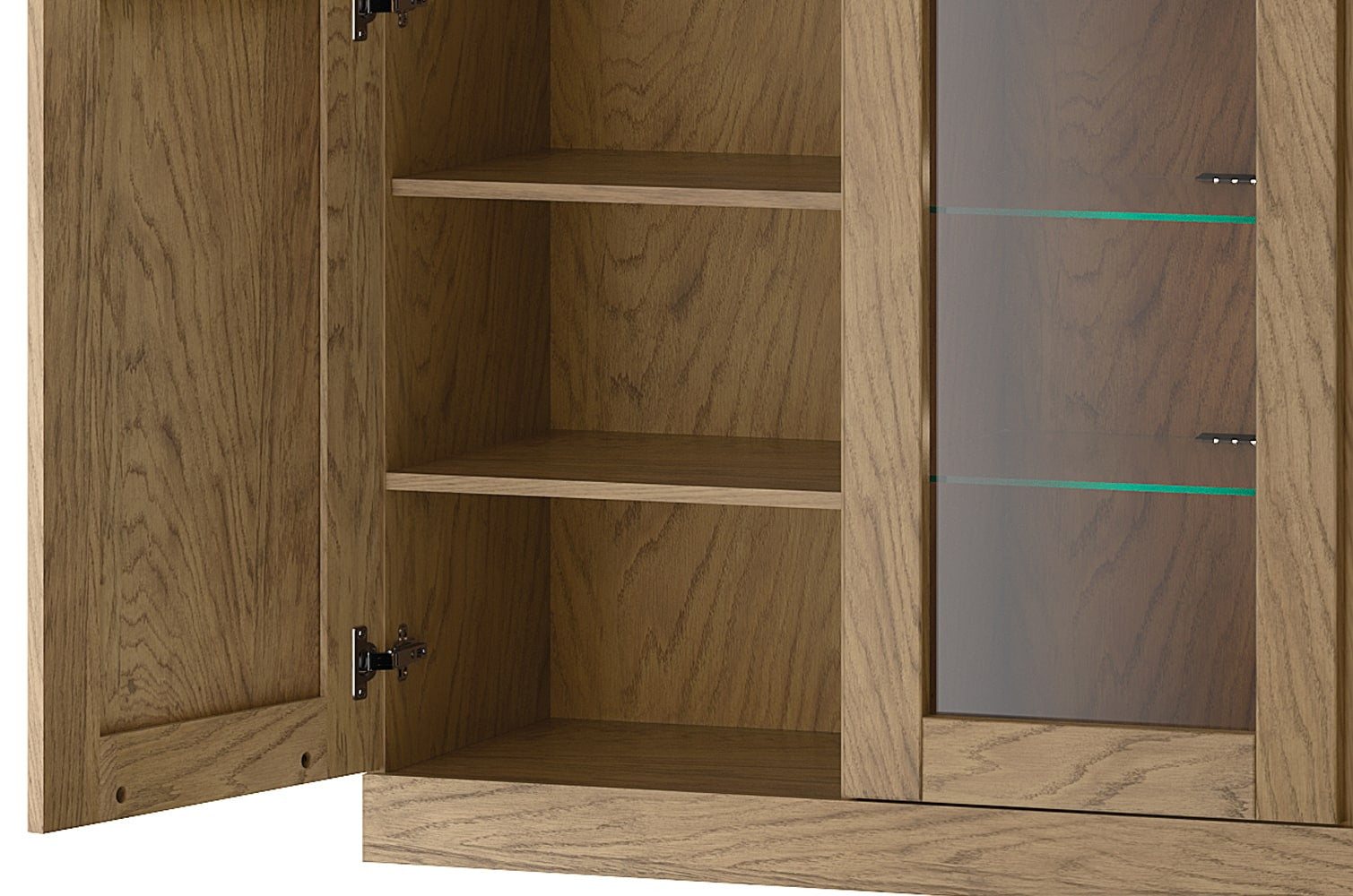Die serienmäßige Innenbeleuchtung hebt die Glasböden hervor und schafft ein warmes und anspruchsvolles Ambiente. Ein vielseitiges Möbelstück, das sowohl in moderne Ess- als auch in Wohnräume passt und schöne Handwerkskunst mit Langlebigkeit verbindet.
