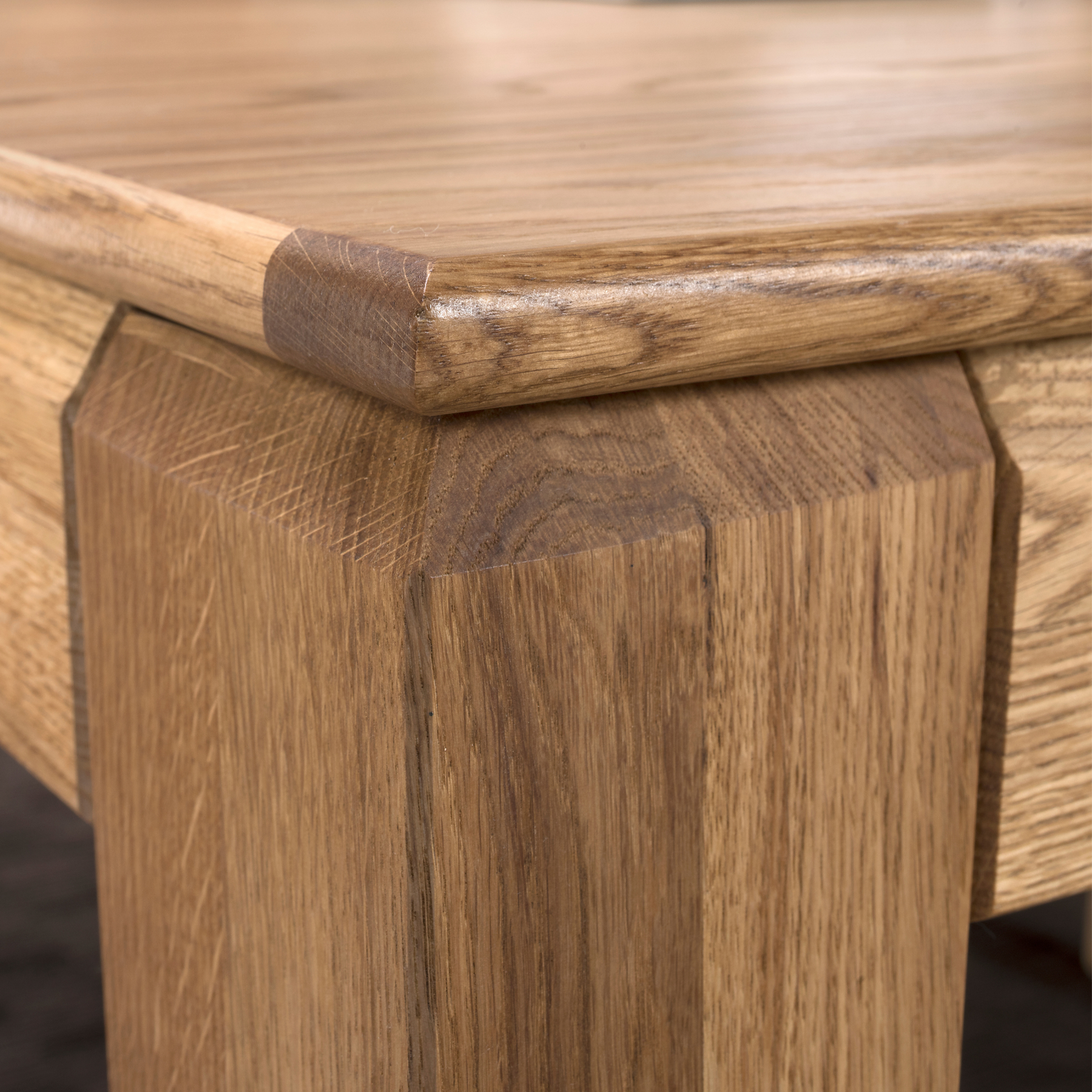 - Arbeitsplatte: Hochwertige Arbeitsplatte mit natürlichem Eichenfurnier + massiver Eichenkante
