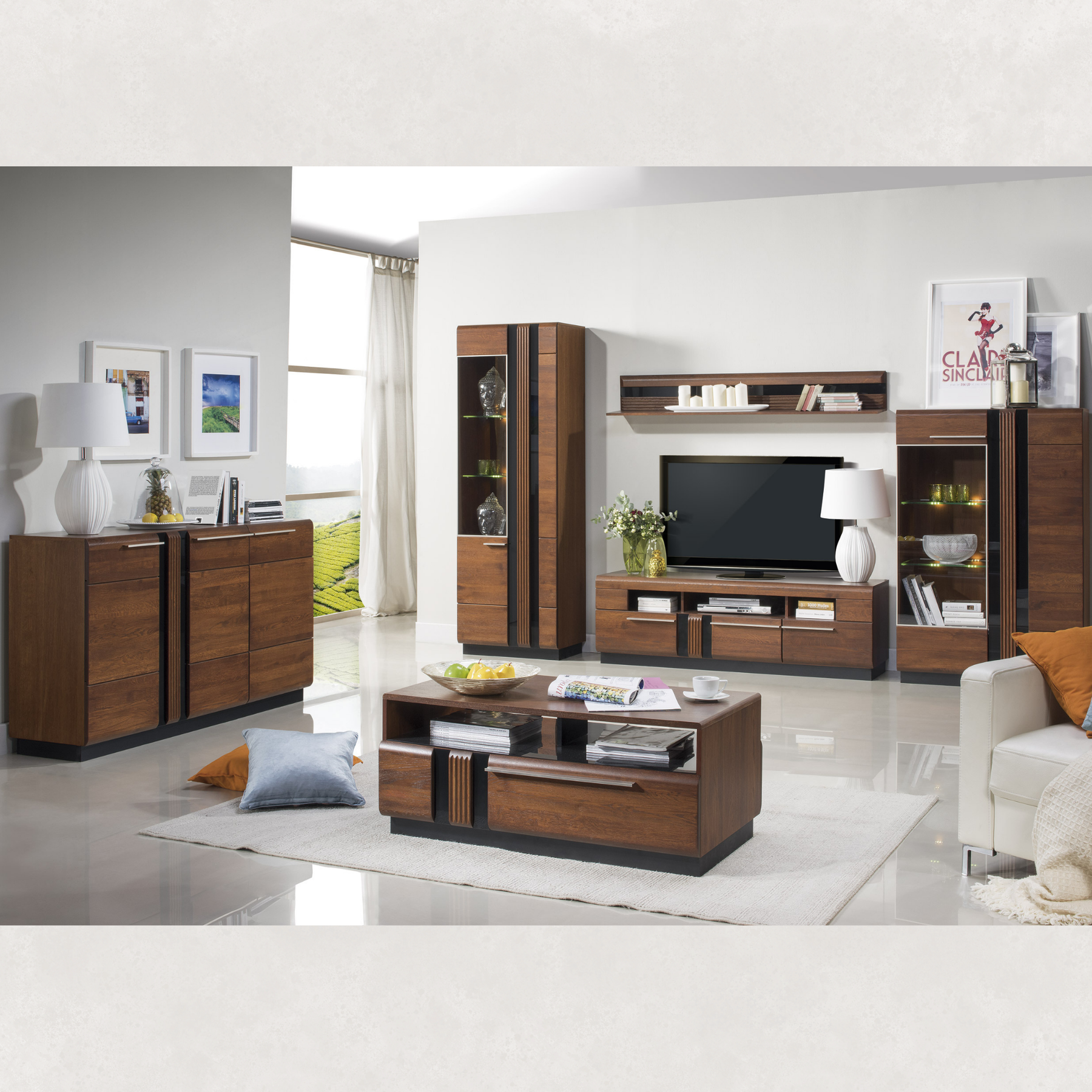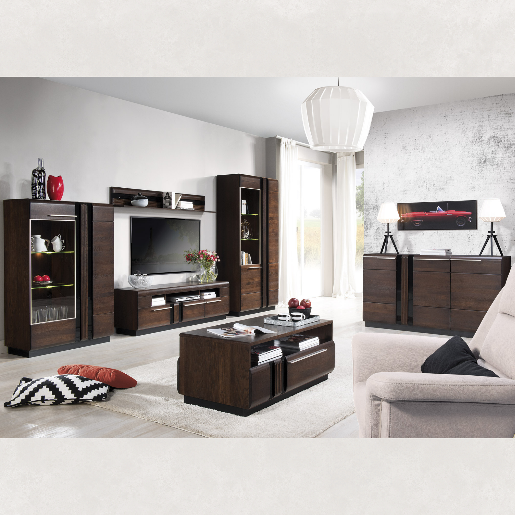 Er verfügt über drei geräumige Schubladen mit Soft-Close-System, ideal für die Aufbewahrung von Zubehör, Bedienelementen und Unterlagen. Außerdem verfügt er über ein offenes Multimedia-Fach für Konsolen, Decoder oder Player, das Platz für Kabel und eine ausreichende Belüftung bietet.