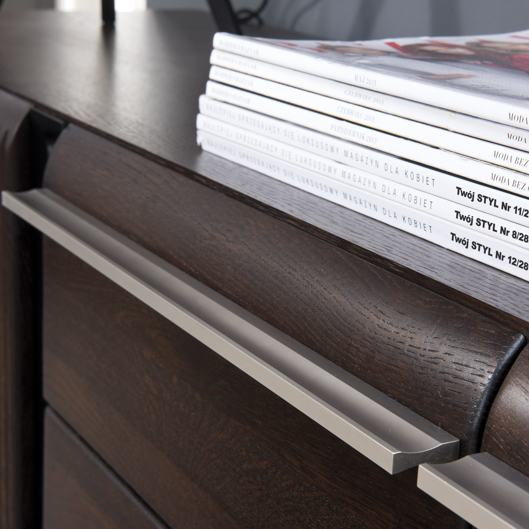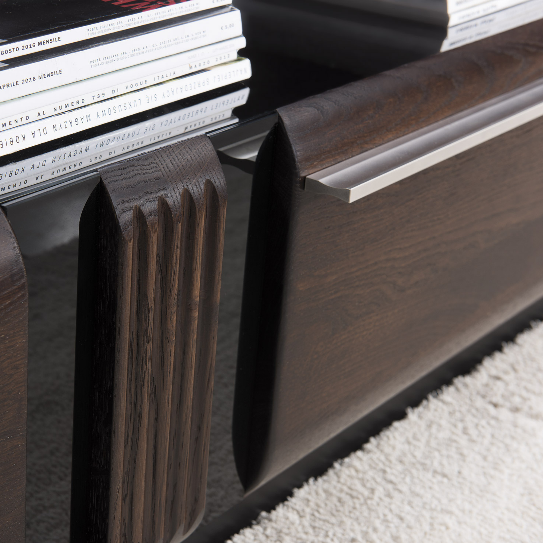 Das TV-Möbel PORTI 25 vereint Design, Funktionalität und eine anspruchsvolle Ästhetik, die jedes Wohnzimmer aufwertet. Seine Front besteht aus massiver Eiche, die von Details aus schwarzem, gehärtetem Glas und den für die PORTI-Kollektion charakteristischen gestreiften Leisten begleitet wird, die Textur und optische Tiefe verleihen.