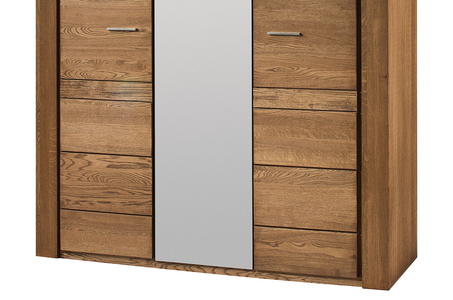 Der Kleiderschrank Samt 73 von drei Türen, die mittlere mit einem Ganzkörperspiegel mit Der dreitürige Kleiderschrank Velvet 73, bei dem die mittlere Tür mit einem Ganzkörperspiegel ausgestattet ist, verleiht Ihrem Schlafzimmer einen modernen und eleganten Touch mit der Wärme von rustikalem geöltem Eichenholz. Massivholz und ein großes Fassungsvermögen für Ihre Kleidung und Accessoires. Sie können ihn mit Möbeln aus der gleichen Velvet-Kollektion kombinieren.