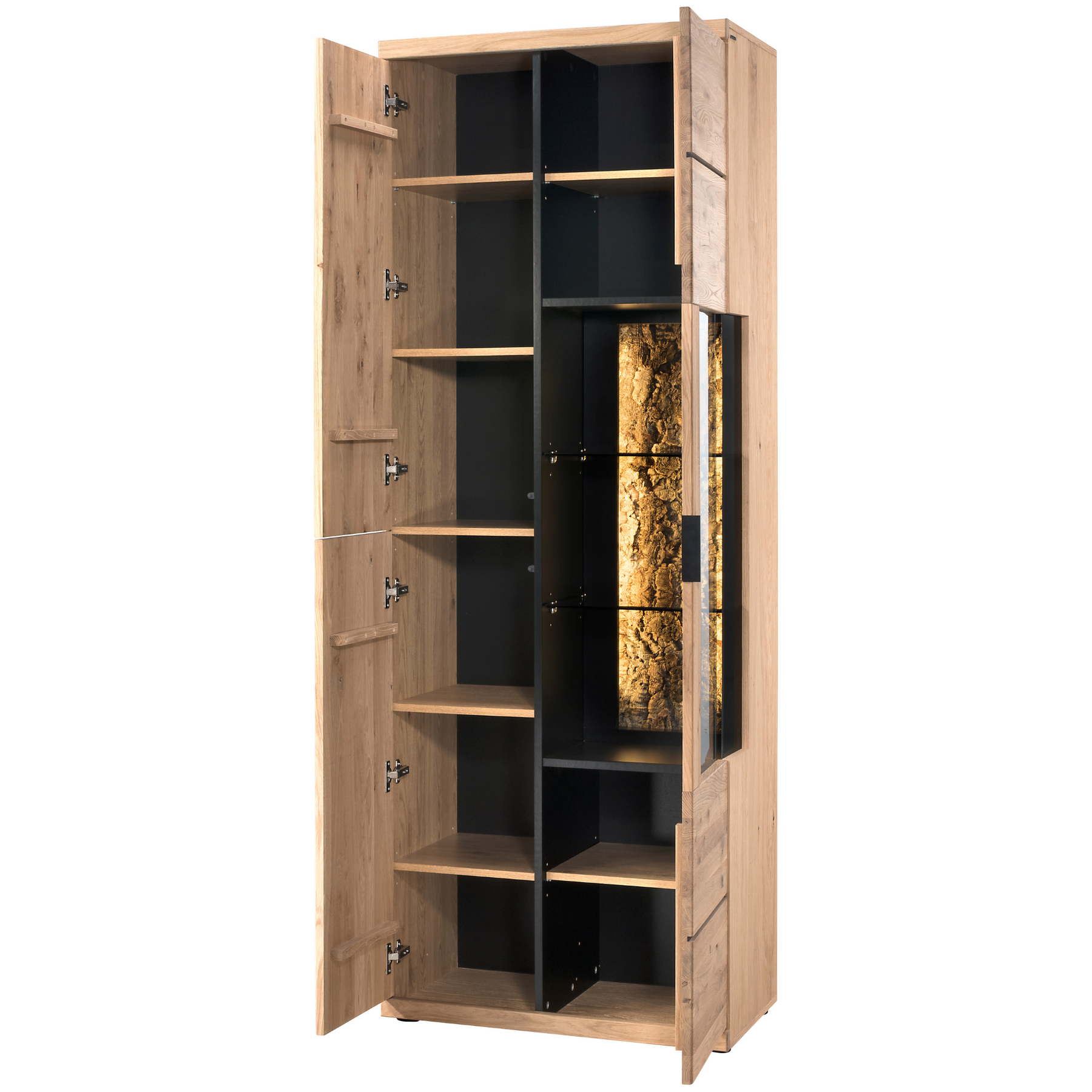 Das Innere wird durch eine warme LED-Beleuchtung hervorgehoben, die die Textur des natürlichen, rindenähnlichen Dekorationshintergrunds hervorhebt und eine gemütliche Atmosphäre voller Charakter schafft. Die Einlegeböden aus gehärtetem Glas sorgen für optische Leichtigkeit und ermöglichen es Ihnen, Geschirr, Dekoration oder Glaswaren stilvoll zu organisieren.