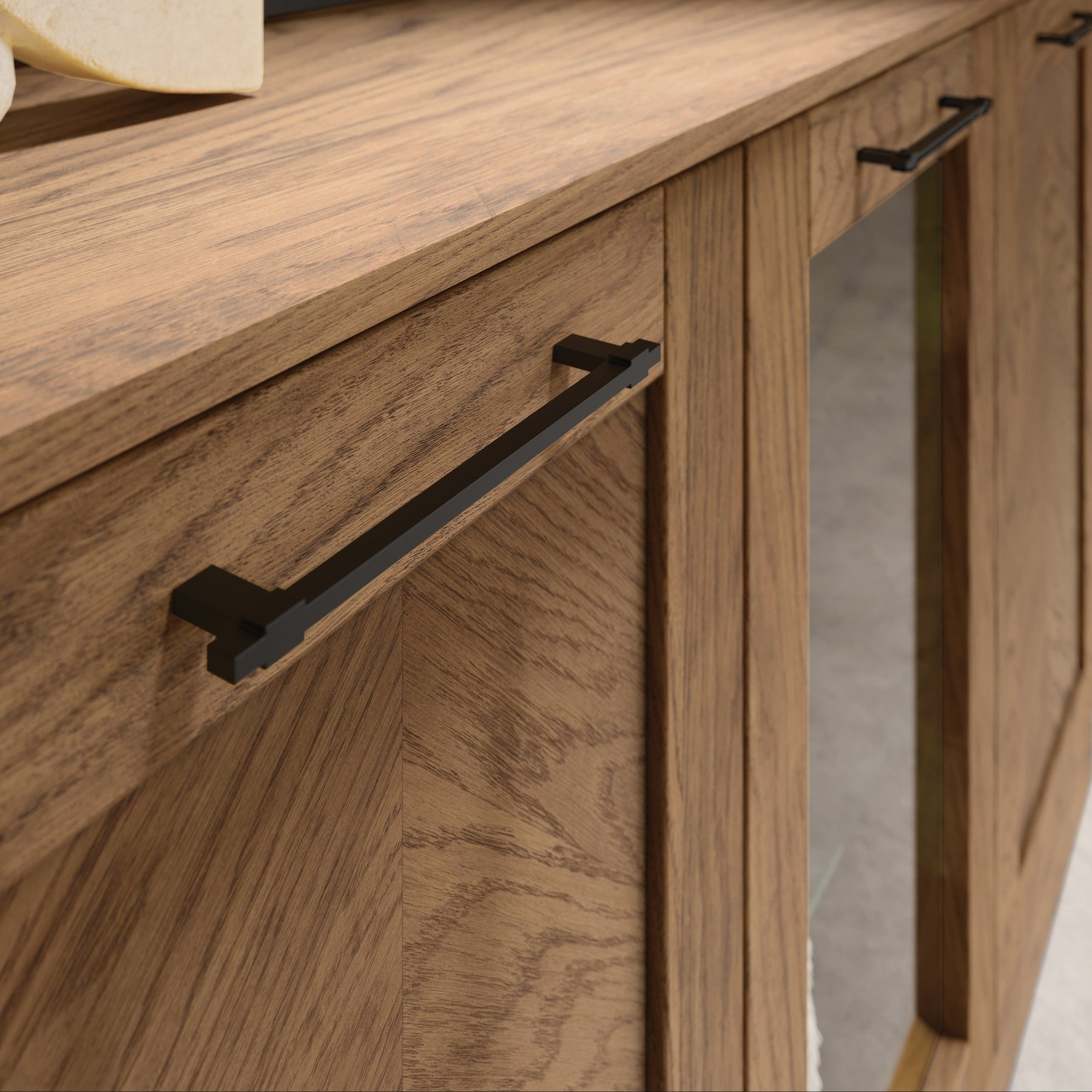 Die Vitrine COZY 10 kombiniert die natürliche Schönheit von rustikalem Eichenholz mit einem modernen Design voller Wärme. Die Massivholzfront mit elegantem Fischgrätenmuster unterstreicht den handwerklichen Charakter des Möbelstücks, während die dezenten mattschwarzen Details für einen modernen und ausgewogenen Touch sorgen.